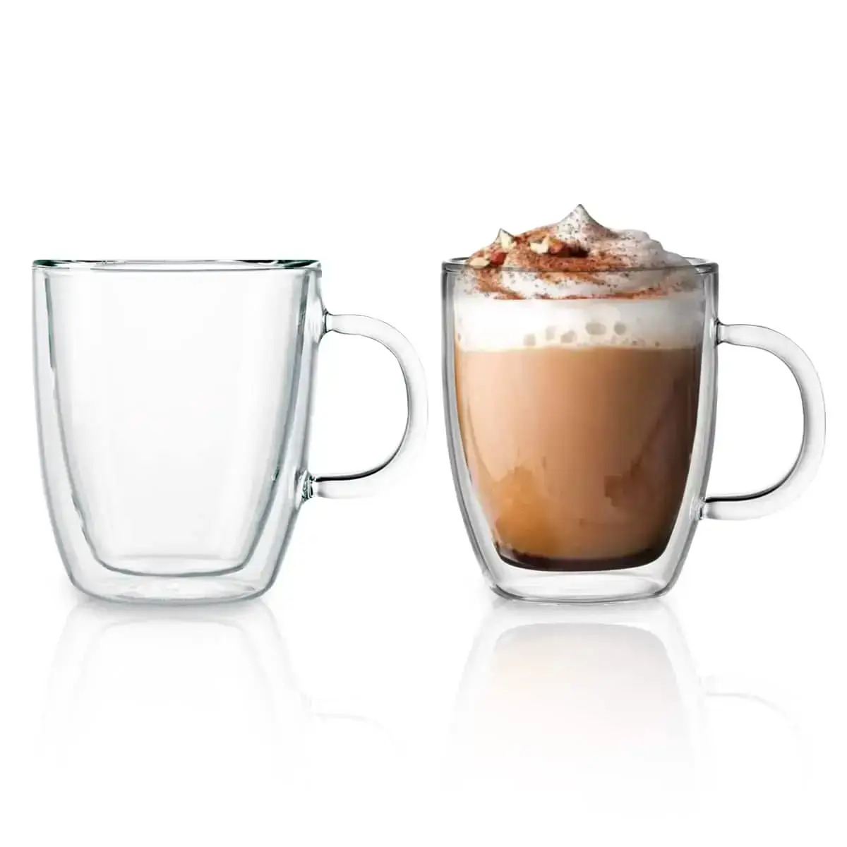 זוג כוסות זכוכית עם ידית. דופן כפולה לבידוד המשקה. זכוכית בורוסילקט עמידה לחום וקור. סטנדרט איכות גבוה. הכוס מתאימה לשימוש במדיח. עיצוב מהודר וקלאסי. אריזת מתנה נפח: 350 מ”ל