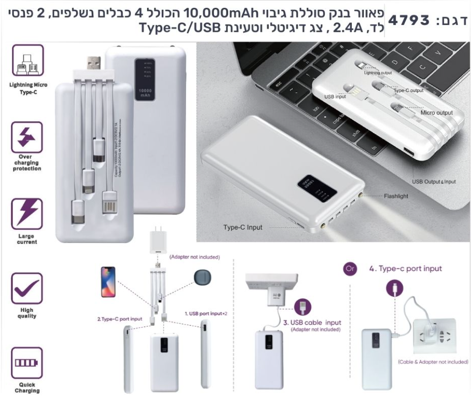 פאוור בנק סוללת גיבוי 10,000MAH הכולל 4 כבלים נשלפים , 2פנסי לד . צג דיגיטלי וטעינת USB/TYPE-C