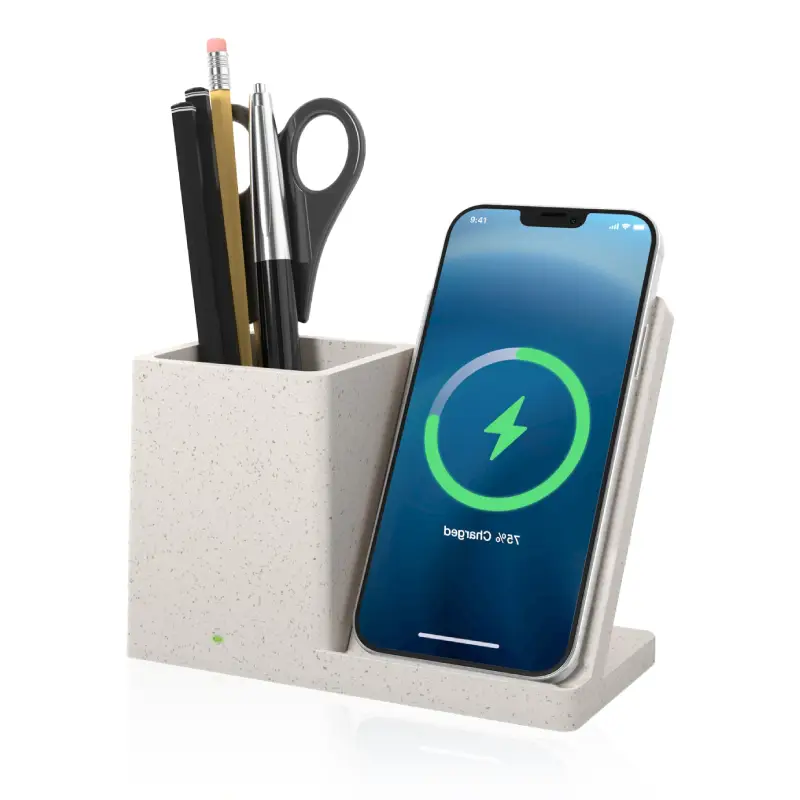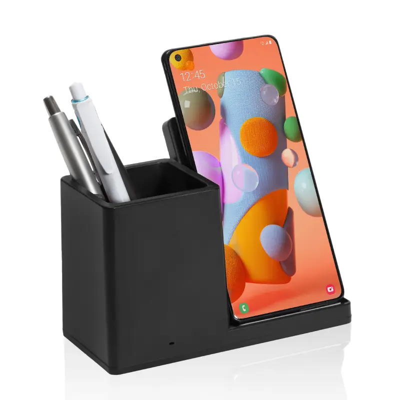 מעמד עם משטח הטענה אלחוטי מעמד שולחני משולב עם משטח הטענה אלחוטי בטכנולוגית QI עוצמת טעינה 15W, FAST CHARGE וכוס לעטים ומכשירי כתיבה 15X7X11 ס"מ