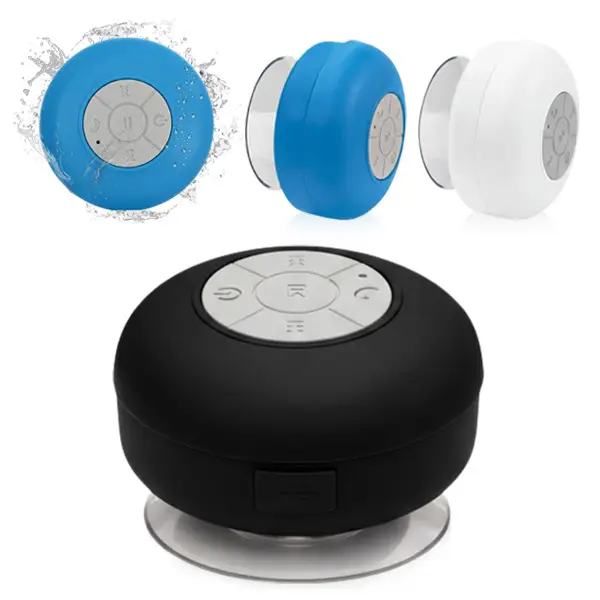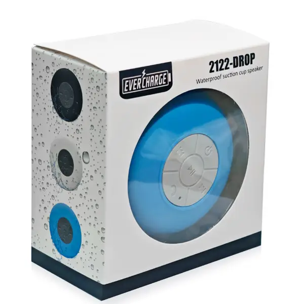 רמקול בלוטוס עם עמידות למים IPX4 מבית EVERCHARGE מתאים לסביבת האמבטיה,בריכה וחוף הים ואקום להצמדה על משטחים כולל דיבורית ולביצוע שיחות מידות בס"מ : 8.5×8.5×5.5